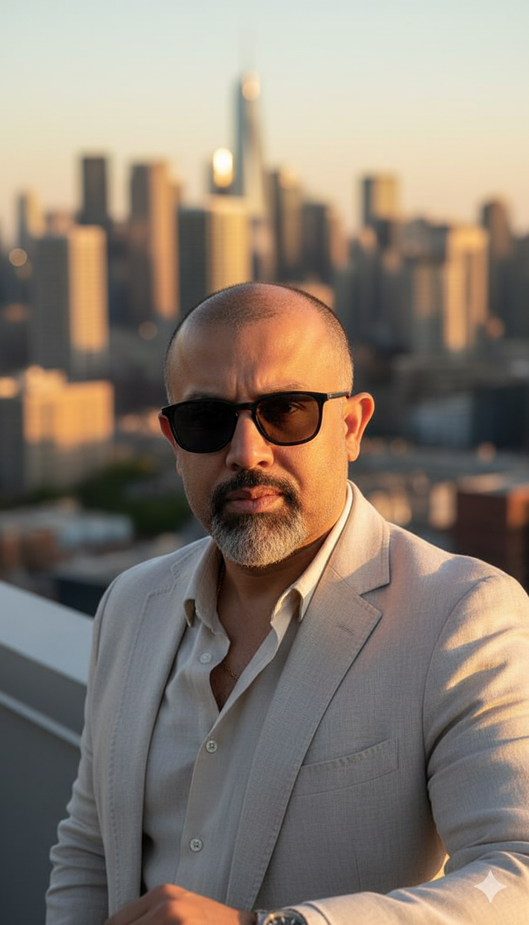 Produce a luxurious rooftop portrait with skyline in the background. Maintain the original selfie’s face without any AI face modification. The subject is in a smart-casual outfit – open collar shirt, linen blazer, watch visible on wrist and black sunglasses. Sunset lighting casts soft golden tones across the skin. Behind, a modern city skyline fades into warm bokeh. Clean, editorial look with professional photography vibes. 4K clarity, vertical 9:16.
