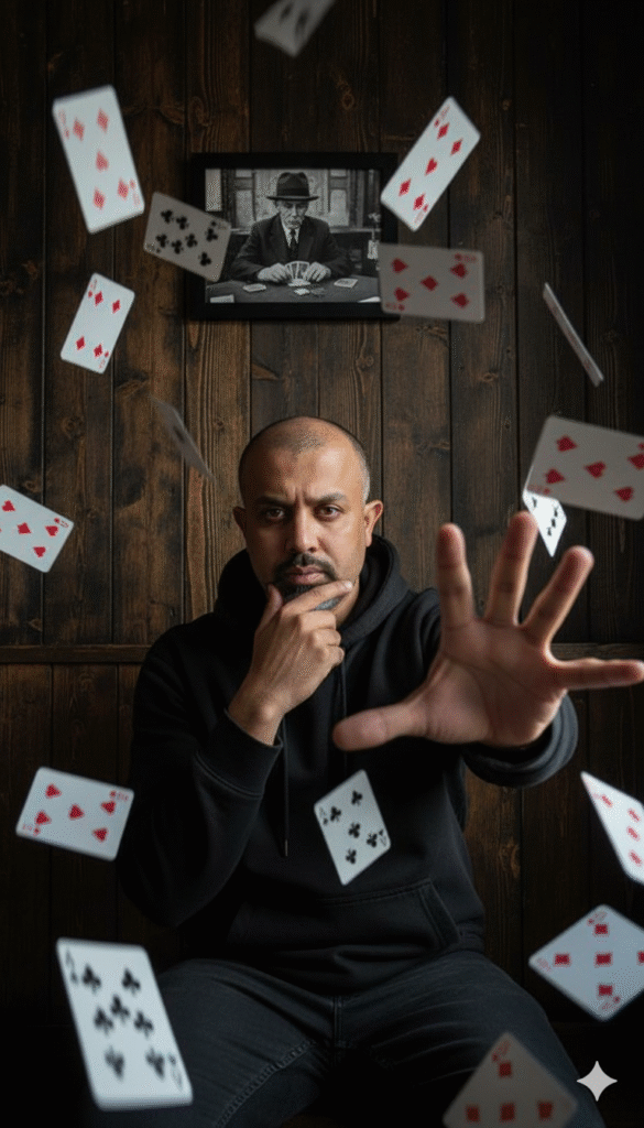 A young man with dark hair (maintain exact face and skin tone with sharp features) wearing a black hoodie sits in a rustic wooden booth, staring intensely at the camera with one hand supporting his chin and the other reaching forward as if performing telekinesis. Dozens of playing cards fly around him in mid-air, captured in dynamic slow-motion with motion blur. The background shows vertical wooden panels and a framed photo of a man playing cards.