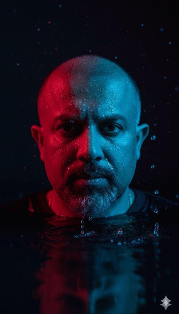Crie um retrato cinematográfico e dramático de mim, com o rosto parcialmente submerso em água escura e a pele molhada com gotas d’água, adicionando textura e realismo. Use iluminação neon contrastante – vermelho intenso de um lado do rosto e azul frio do outro – para criar uma atmosfera sombria e cyberpunk. O fundo deve ser escuro e minimalista, com reflexos sutis e respingos de água. O estilo é hiper-realista, com alto nível de detalhe na textura da pele e nas gotas de água. Foque em alto contraste e jogo de luz e sombra para intensificar o impacto visual. O olhar deve ser penetrante e misterioso.