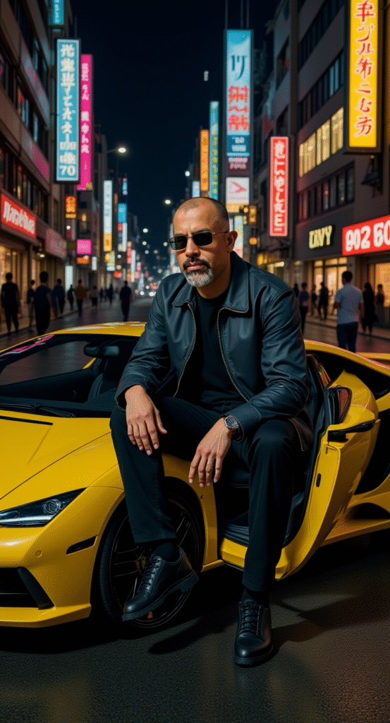 A young man with an ideal, well-proportioned body is sitting casually in a luxurious yellow Pagani Huayra parked on the side of a street in Tokyo at night. His hair is cut short, with the front slightly messy, giving an effortless yet stylish impression. He wears a casual Japanese street-style outfit: a dark oversized jacket, a basic black t-shirt, loose-fit pants, clean sneakers, and black sunglasses. There car’s front door is wide open. One of his legs is still inside the car, while the other rests on the wet asphalt, creating a laid-back yet stylish pose. His hand rests casually on his knee, and his face is slightly turned toward the camera, with a calm and confident expression staring as if he’s in a movie. The background captures the iconic night atmosphere of Tokyo: colorful neon lights, large digital billboards, shops with Japanese signs, and wet streets reflecting the lights after rain. A few pedestrians walk in the distance, adding an urban vibe while keeping the focus on the main subject. Aspect ratio: 9:16
